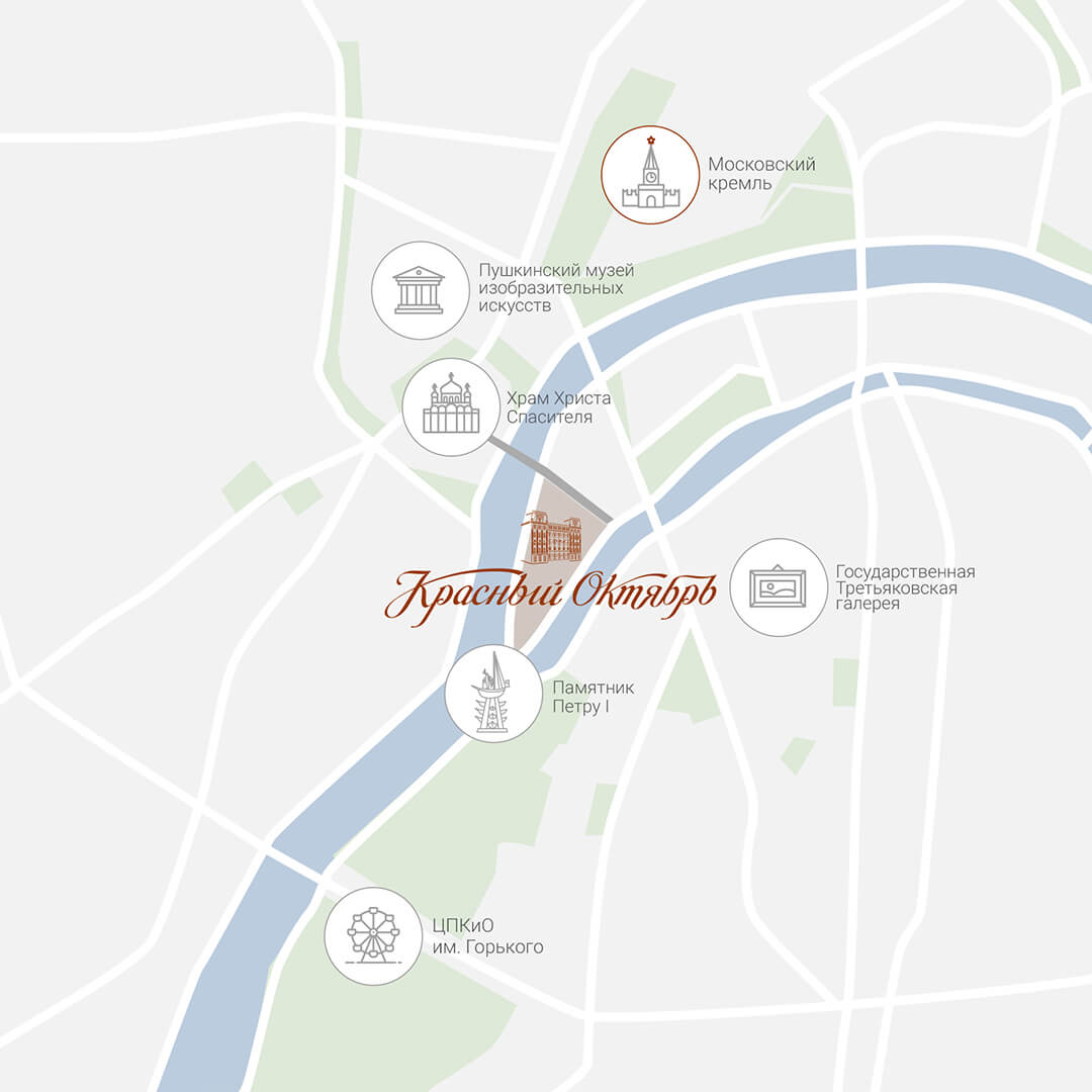 Резиденция «Красный Октябрь» расположена на стрелке Болотного острова, окруженной Москвой-рекой и Водоотводным каналом, находится в непосредственной близости от Храма Христа Спасителя, Кремля, Третьяковской галереи, Пушкинского музея, Парка искусств МУЗЕОН и Парка Горького.